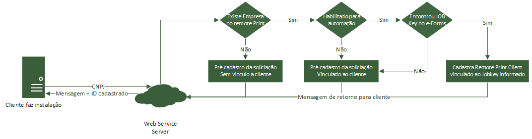 Ele utiliza o modelo de instalação simplificada onde alguns dados como endereço do server já estão pré configurados (na geração do instalador). Ao abrir a tela de instalação é solicitado o Jobkey, é através dele que o processo vai fazer o vinculo automático e deixar o client pronto para uso. O processo de configuração segue o seguinte fluxo: