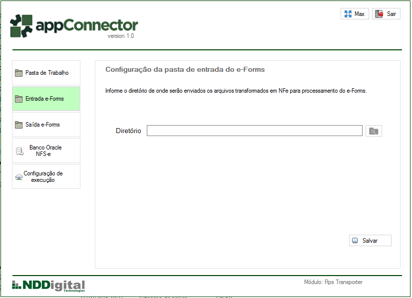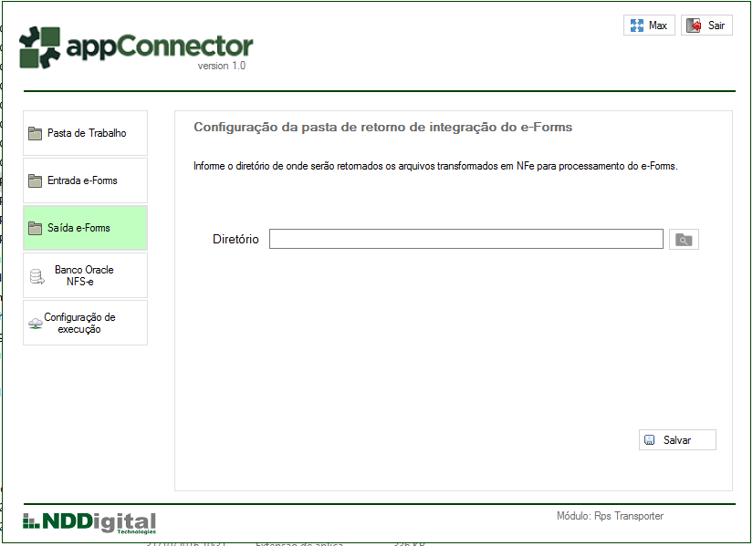 Nesta tela é configurado o diretório em que será retornado o documento proveniente do NDDigital e-Forms (clique na imagem para ampliar)