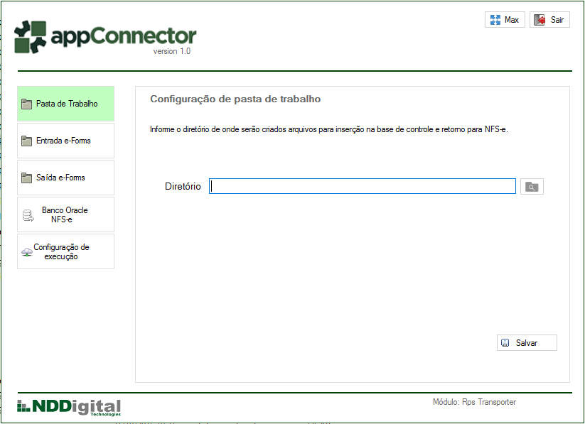 Diretório: Diretório onde serão gravados os documentos de emissão capturados da base para envio a SEFAZ através da mensageria NDDigital e-Forms. Neste diretório a aplicação irá dividir em subdiretórios conforme os JobKeys configurados na aplicação.