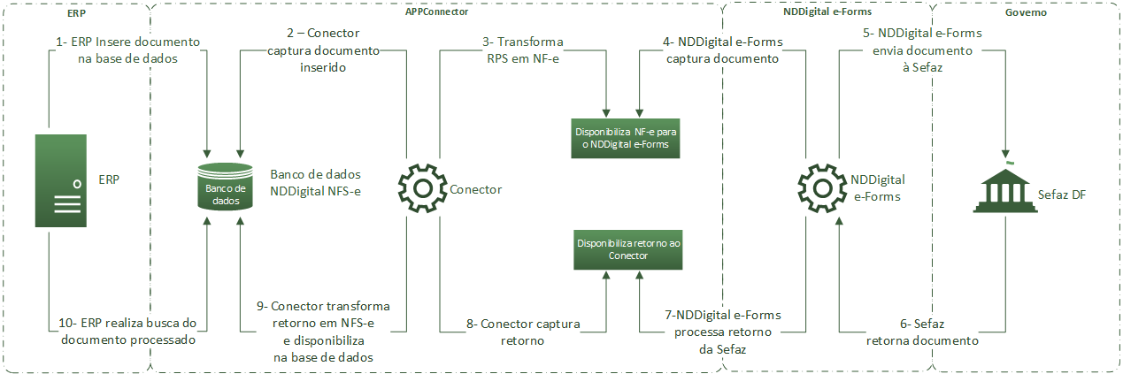 Para realizar a integração dos documentos o RPS Transporter captura a nota fiscal armazenada em banco pelo ERP e converte para NF-e, disponibilizando o documento transformado para o serviço de mensageria NDDigital e-Forms, já consolidado no mercado e utilizado por grandes corporações por todo o país, que tem por finalidade enviar e integrar os documentos com os sistemas do governo. Após o envio da nota, o RPS Transporter devolve o retorno do processamento da NF-e, em layout NFS-e, disponibilizando-o em banco garantindo assim total integração com o sistema de origem da nota fiscal de serviço.