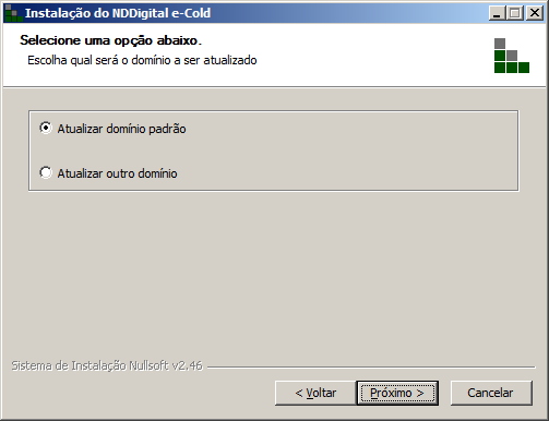 Para atualizar outro domínio, selecione essa opção e outros domínios serão instalados ao realizar a instalação do sistema e-Forms mais de um vez, através de múltiplos domínios, ao selecionar esta opção será apresentada a tela abaixo para informar o nome do domínio escolhido para ser realizada a atualização.