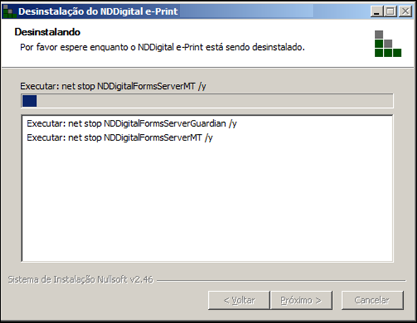 Passo 2: Progresso da Desinstalação: Será mostrado o progresso da desinstalação do NDDigital e-Print.