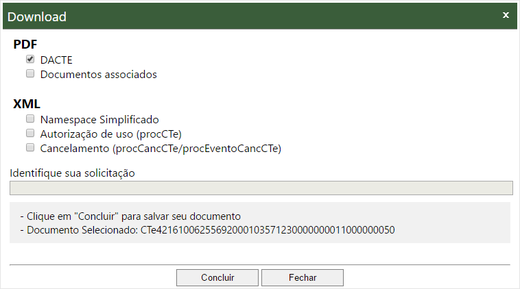 Após marcar os documentos e formato desejado, identifique a solicitação, clique em Concluir. É informado ao usuário sobre o sucesso ou não da geração da requisição.