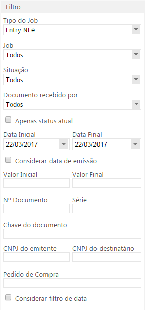 No Filtro Avançado para documentos Entry NF-e é possível efetuar pesquisas por Valor inicial e Valor final, Número, Série, Chave do Documento, CNPJ do Emitente, CNPJ do Destinatário, Pedido de Compra ou filtrar por Considerar Filtro de Data.
