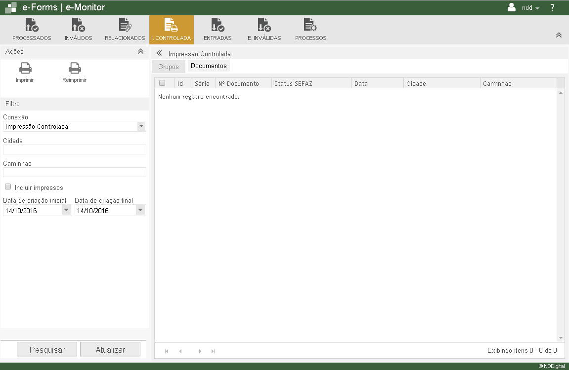 A aba Documentos somente é exibida quando configurado em Impressão Controlada o tipo de campo Filtro.