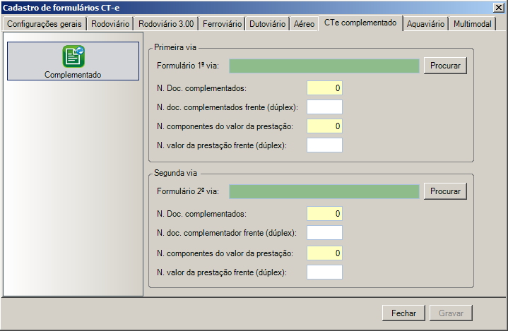 para selecionar o PDF que será a primeira página deste modal e informe o número de documentos complementados e o número de componentes do valor da prestação. Informe também o PDF da segunda página, o número de documentos originários desta e também o número de componentes do valor da prestação, que podem ser impressos nesta página.