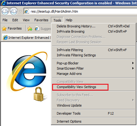 Abrir o navegador e ir em Ferramentas selecione a opção Configurações do modo de Exibição de Compatibilidade conforme abaixo: