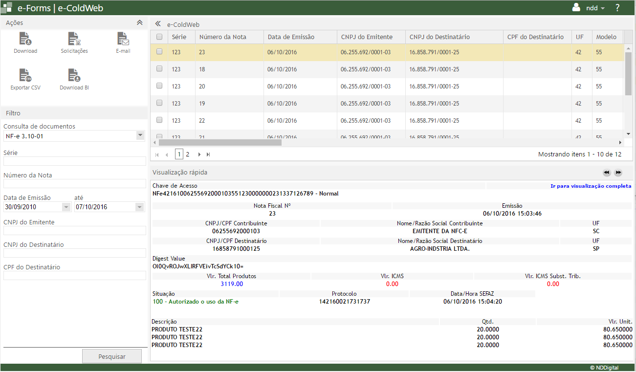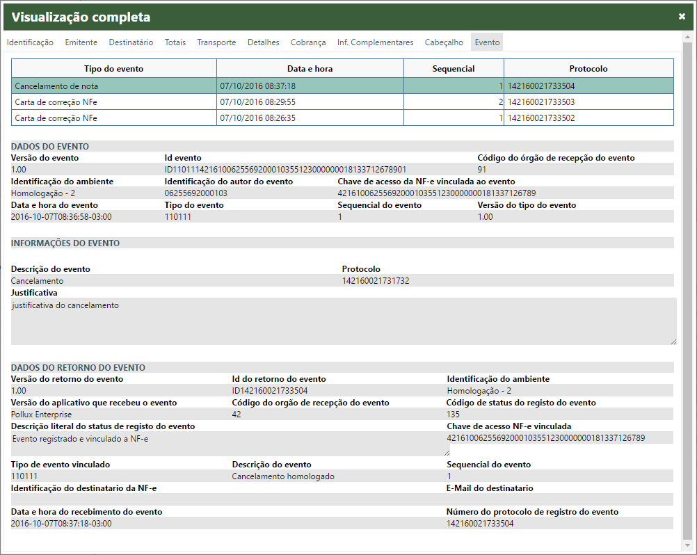 Uma nova tela será aberta com todos os dados da NF-e/CT-e/MDF-e selecionada.