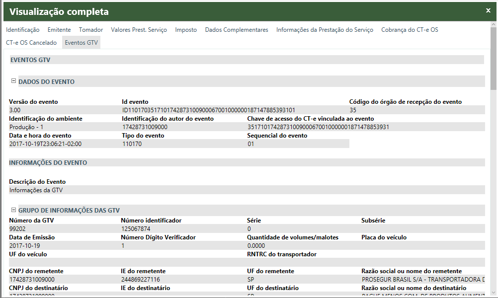 Quando for um documento de CT-eOS e existir um evento vinculado será exibida a tela a baixo, onde será demonstrado o evento em uma aba especifica: