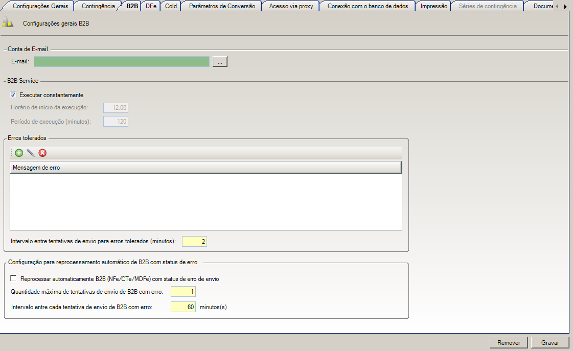 Quando a opção de Executar Constantemente estiver desmarcada as opções da "Configuração para reprocessamento automático de B2B para status erro" serão desabilitadas.
