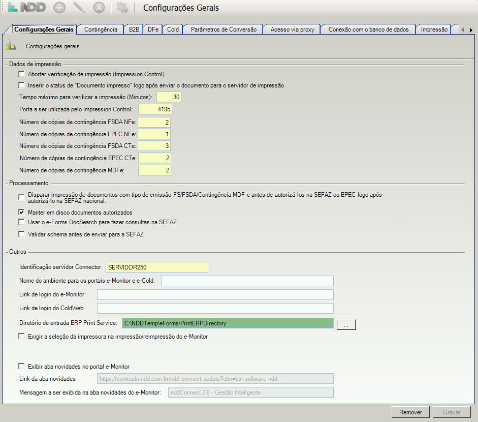 Abortar verificação de impressão (Impression Control): esta opção desabilita a comunicação com o Impression Control, serviço que é instalado com o módulo e-Print e é responsável por confirmar a impressão dos documentos.