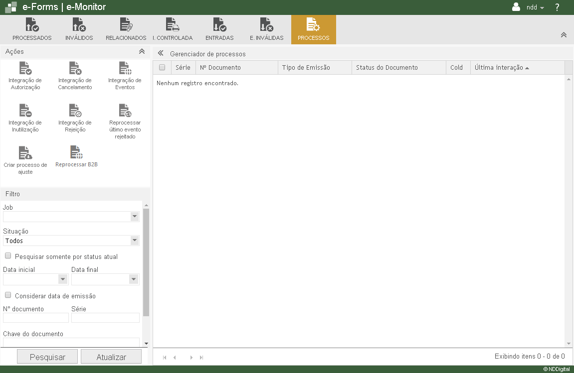 Nesta aba são exibidos todos os documentos processados pela solução onde será possível redisparar as integrações para o ERP.