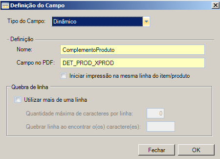 f.No campo Nome, deverá ser colocado o que é informado no segundo valor da linha 30100, no exemplo, ComplementoProduto, respeitando letras maiúsculas e minúsculas. Na configuração Campo no PDF deve-se informar qual campo no PDF receberá a informação que estará contida na linha 30100 no terceiro valor, no exemplo, Complemento poderá ser utilizado um campo que já faça parte do Layout da nota fiscal, como a descrição do produto que é impressa utilizando o campo DET_PROD_XPROD, ou pode ser utilizado um novo campo para impressão.