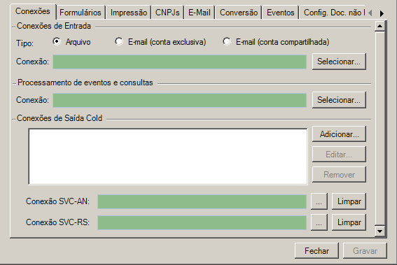 e adicione o local de captura dos documentos de entrada quando o processamento for para eventos ou consultas. A conexão de entrada para processamento de eventos e consultas está disponível somente para entrada baseada em arquivos ou baseado em banco de dados, e somente será permitido processar arquivos no formato TXT ou XML do eventos NF-e (manifestação do destinatário) ou com o prefixo ped-evt ou arquivos para consultas no formato ped-cons, ped-list e ped-down.
