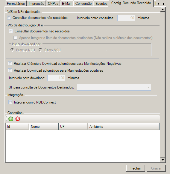k.A aba Configuração de documento não recebido permite consultar os documentos autorizados na Sefaz que não foram recebidos pelo sistema, realizar download automático após manifestações positivas ou negativas ou Integrar com o NDDConnect.