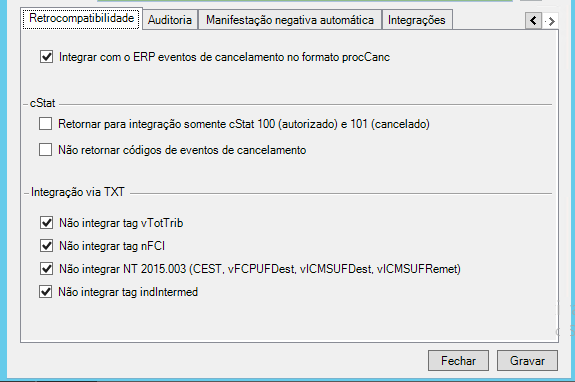 •Quando marcada a opção Não retornar códigos de eventos de cancelamento, fará com que os documentos cancelados por cStat 135 retorne na integração o cStat 101, e cancelados pelo cStat 155 integrar o cStat 151.