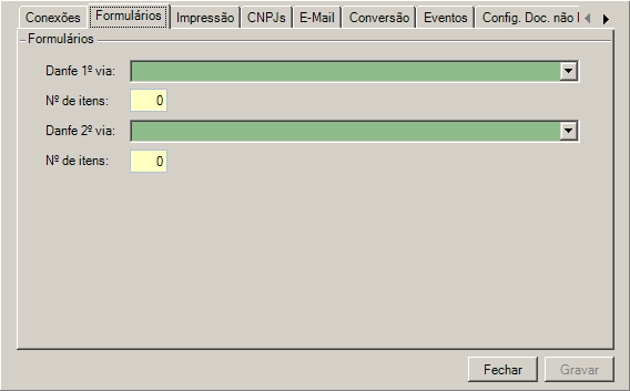 e.A aba Formulários será habilitada somente quando for selecionada nas conexões de saída uma conexão Cold NF-e. Selecione as 1ª e 2ª vias do DANFE previamente cadastradas e digite o número de itens para cada via.