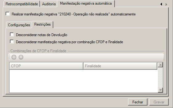 •Desconsiderar manifestação negativa por combinação CFOP e Finalidade: Ao marcar está opção será habilitado para cadastro o GRID "Combinações de CFOP e Finalidade" onde após acionar o botão