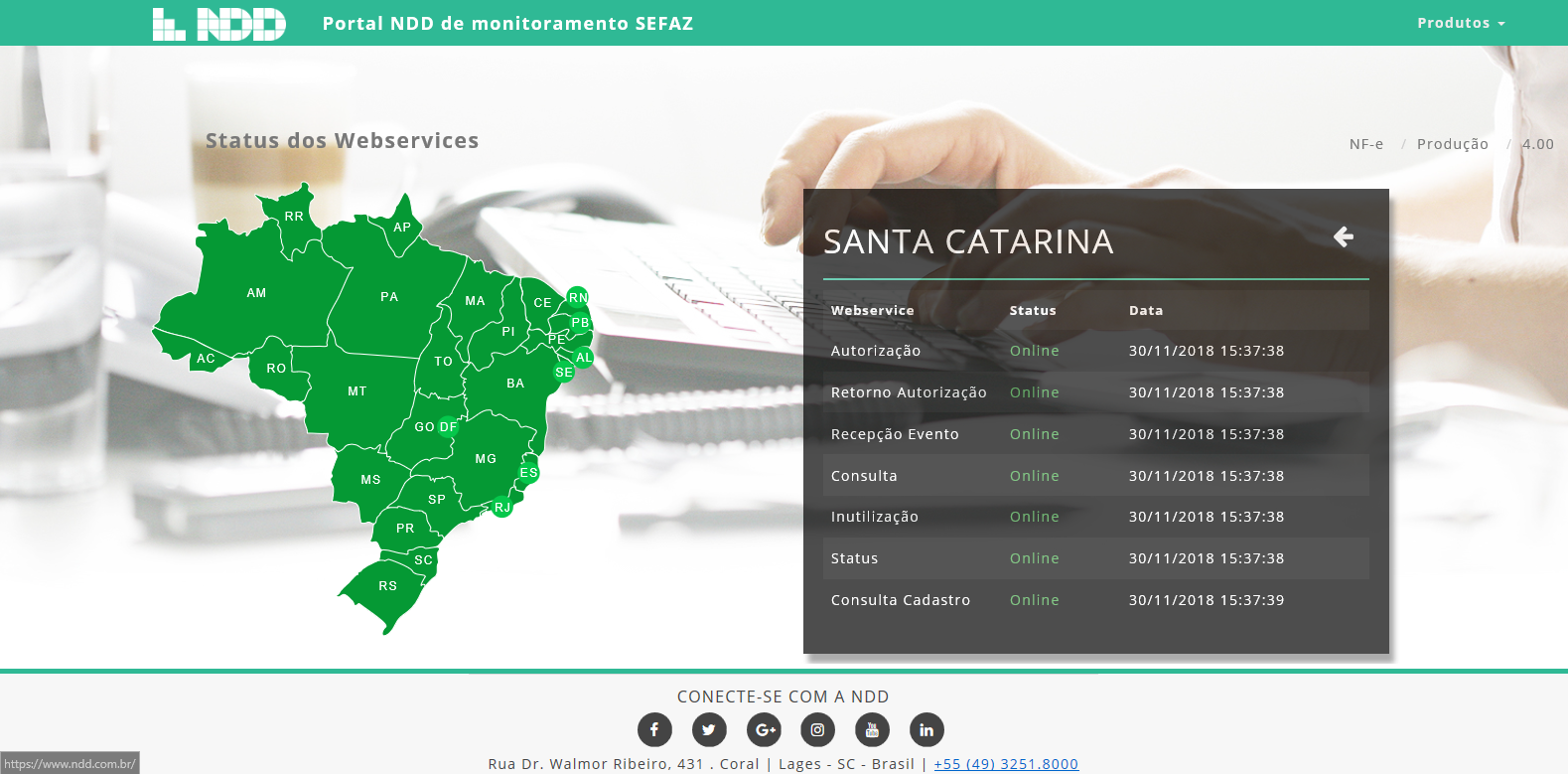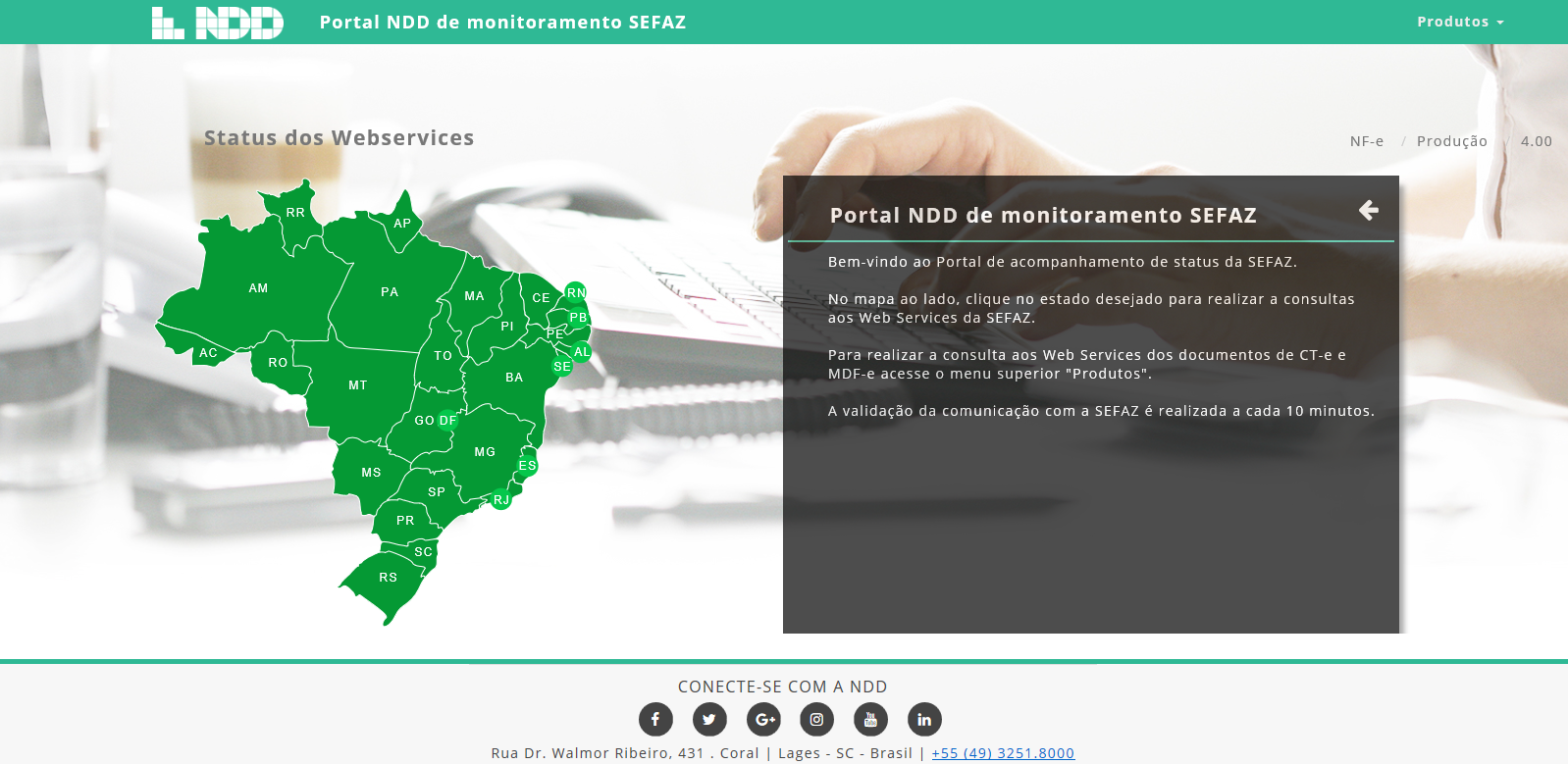Ao selecionar uma das opções de ambiente para qualquer tipo de documento, será aberta uma nova página contendo os status dos Web Services por estado, conforme imagem a baixo: