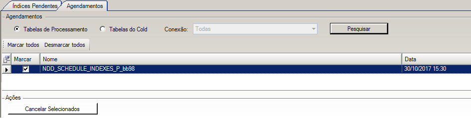 Caso deseje interromper um processo agendado, selecione a tabela e clique em, "Cancelar Selecionados". Assim o processo será abortando.