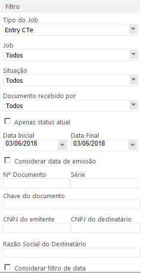 No Filtro Avançado para documentos Entry CT-e é possível efetuar pesquisas por Número, Série, Chave do Documento, CNPJ do Emitente, CNPJ do Destinatário ou filtrar por Considerar Filtro de Data.