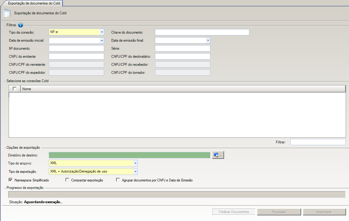 c.Selecione uma conexão Cold de NF-e, CT-e ou MDF-e para pesquisar os documentos.