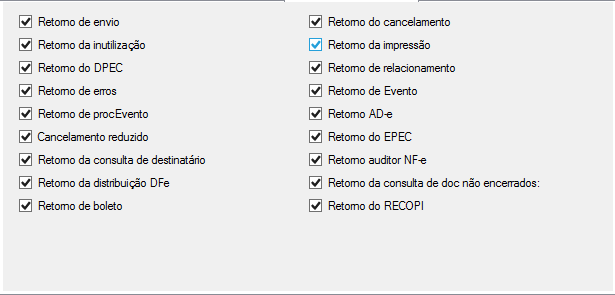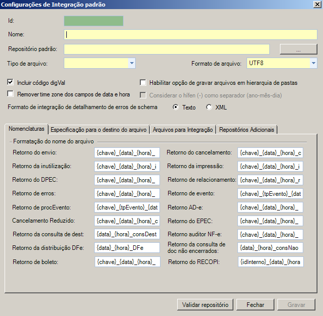 •Formatação do nome do arquivo: nome que será dado aos arquivos de retorno do envio, retorno do cancelamento, retorno da inutilização, retorno da impressão, retorno do DPEC, retorno de relacionamento, retorno de erros, retorno de evento, retorno de procEvento, retorno AD-e, cancelamento reduzido, Retorno do EPEC e retorno da consulta de dest., retorno auditor, retorno da distribuição DF-e e retorno da consulta de doc não encerrados. O nome do arquivo pode receber três parâmetros para diferenciá-lo, são eles: chave de acesso {chave}, data de envio {data}, hora de envio {hora} o tipo de evento {tpEvento} é o parâmetro utilizado somente para retorno de eventos. Também é possível utilizar uma literal no final ou no início desses arquivos.