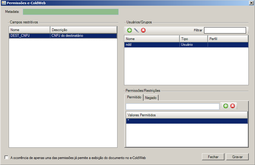 Os campos restritivos exibidos nas permissões deverão ter sido previamente cadastrados na Conexão de Saída Cold> Gerenciar Metadata |