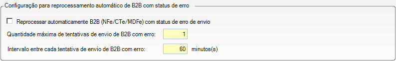 i. Na aba de B2B está disponível a opções de Configuração para reprocessamento automático de B2B para status erro. Ao selecionar a opção de Reprocessar automaticamente B2B (NFe/CTe/MDFe) com Status de erro de envio será realizado o reprocessamento(s) do e-mail(s) que não foram enviados com sucesso, de acordo com a Quantidade máxima de tentativas de envio de B2B com erro configurada e respeitando o tempo do campo Intervalo entre cada tentativa de envio de B2B com erro.