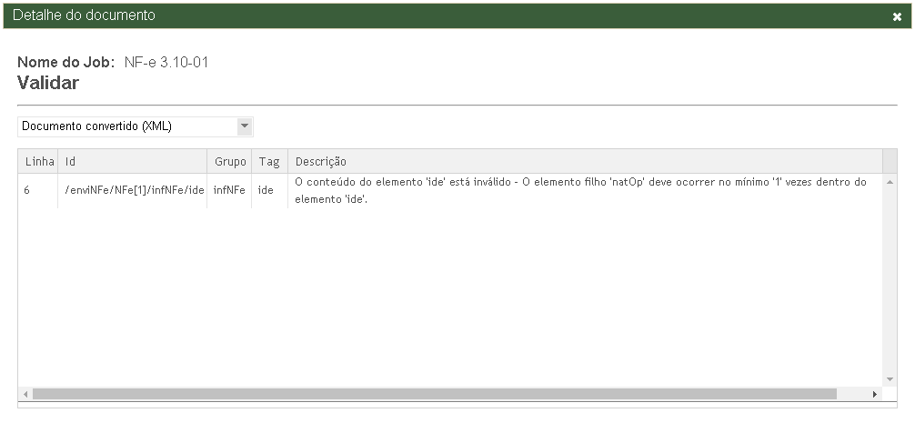 Na aba de Documentos Inválidos, é possível efetuar a validação dos documentos com erro, através do Validador Web, basta efetuar duplo clique no documento desejado. Será exibida uma tela detalhando as inconsistências existentes no documento em questão, bem como o número do documento, a linha que contém erro, o ID da mesma e a Tag correspondente.