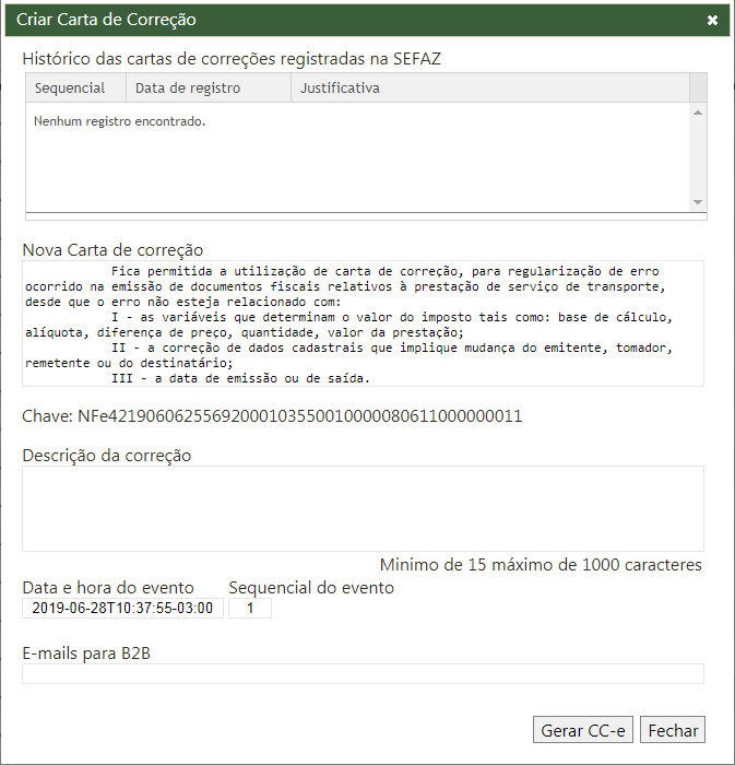 •Será visível a chave do documento ao ser considerada para a emissão da CC-e;