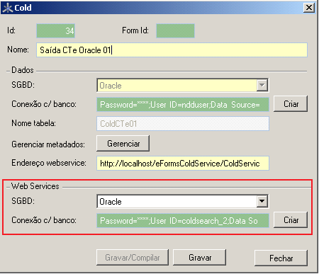O banco de processamento do web service de pesquisa no e-Cold (Cold Search), deve ser referenciado na configuração de saída e-Cold, dentro do e-Forms e-Connector Settings, conforme segue a imagem: