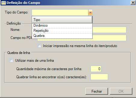 Quebrar linha ao encontrar o(os) caracteres(es): Pode ser preenchido com qualquer valor de 1 a 5, de preferência deve ser escolhido um valor atípico para não prejudicar o texto, visto que a remoção do valor ocorrerá, sendo apenas para determinar o momento da quebra do campo. Quando este campo estiver em branco deverá ser preenchido o campo "Quantidade máxima de caracteres por linha".