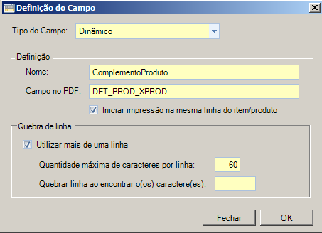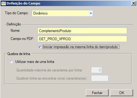 f.No campo Nome, deverá ser colocado o que é informado no segundo valor da linha 30100, no exemplo, ComplementoProduto, respeitando letras maiúsculas e minúsculas. Na configuração Campo no PDF deve-se informar qual campo no PDF receberá a informação que estará contida na linha 30100 no terceiro valor, no exemplo, Complemento poderá ser utilizado um campo que já faça parte do Layout da nota fiscal, como a descrição do produto que é impressa utilizando o campo DET_PROD_XPROD, ou pode ser utilizado um novo campo para impressão.