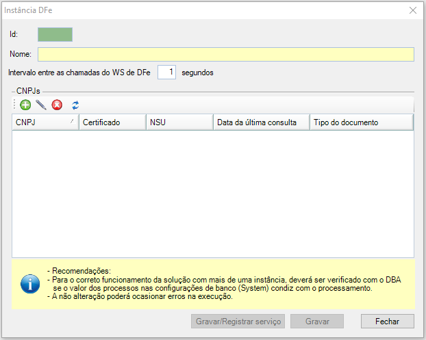 d. A opção "Intervalo entre as chamadas do WS de DF-e" se refere ao tempo de espera entre uma chamada e outra para a SEFAZ. Deve ser informado um valor numérico inteiro, ente 0 à 99 (segundos), possuindo como padrão 1 segundo.