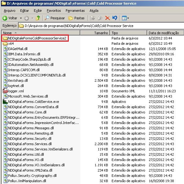 j.Clique em Gravar/Registrar Serviço, uma mensagem de confirmação será exibida. Com essa ação o sistema deverá criar uma nova instância do serviço e também um diretório no caminho <Raiz>\Arquivos de programas\NDDigital\e-Forms\Cold\Cold Processor Service, como mostram as imagens abaixo: