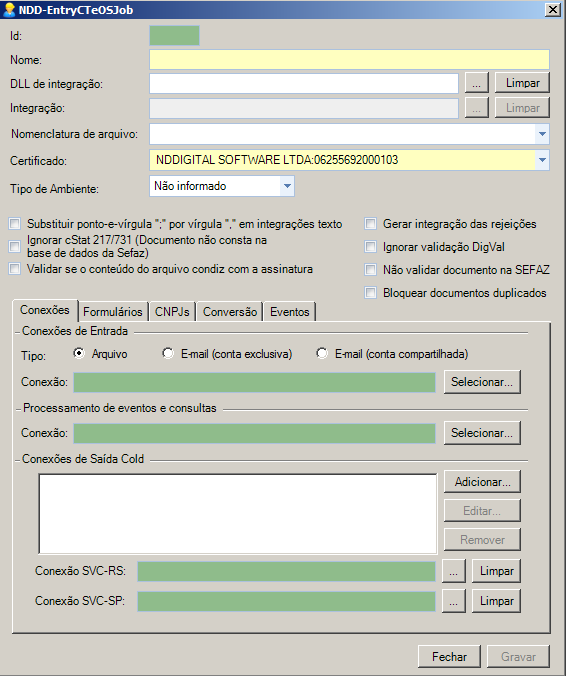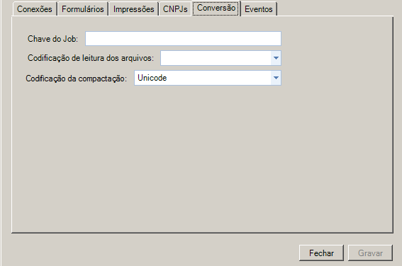 A aba conversão está disponível somente para entrada de eventos de manifestação do destinatário. Caso o Job não possua entrada baseada em banco de dados, o campo Chave do Job é opcional. Utilizando conexão de entrada baseada em BD, será obrigatório o preenchimento deste campo. |