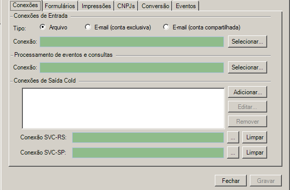 e adicione o local de captura dos documentos de entrada quando o processamento for para eventos ou consultas. A conexão de entrada para processamento de eventos e consultas está disponível somente para entrada baseada em arquivos ou baseado em banco de dados, e somente será permitido processar arquivos no formato TXT ou XML do CT-e 3.00 (prestação do serviço em desacordo) ou com o prefixo ped-evt ou arquivos para consultas no formato ped-cons.