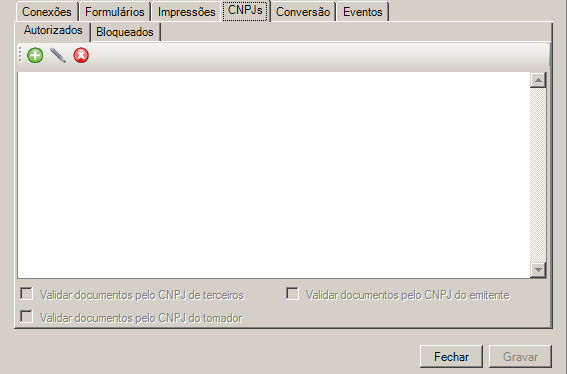 para inserir os CNPJs desejados, podendo ser informado apenas o CNPJ raiz e para ser permitidos apenas os documentos com o CNPJ previamente cadastrado deverá ser marcado uma das opções abaixo: