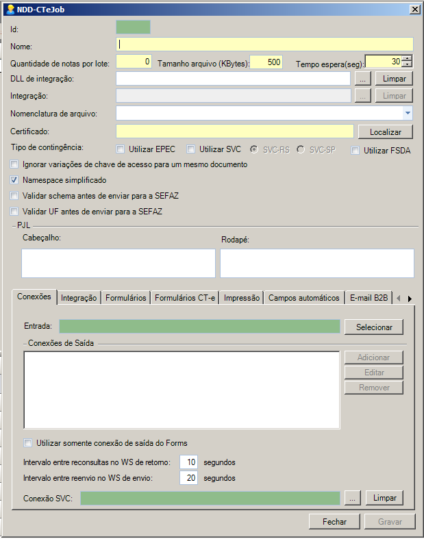 Caso seja processada uma CT-e com o tipo de emissão 7 (SVC-RS) ou 8 (SVC-SP) e não estejam configurados os WebServices na conexão de saída SVC será utilizada para o envio a conexão de saída vinculada ao job.