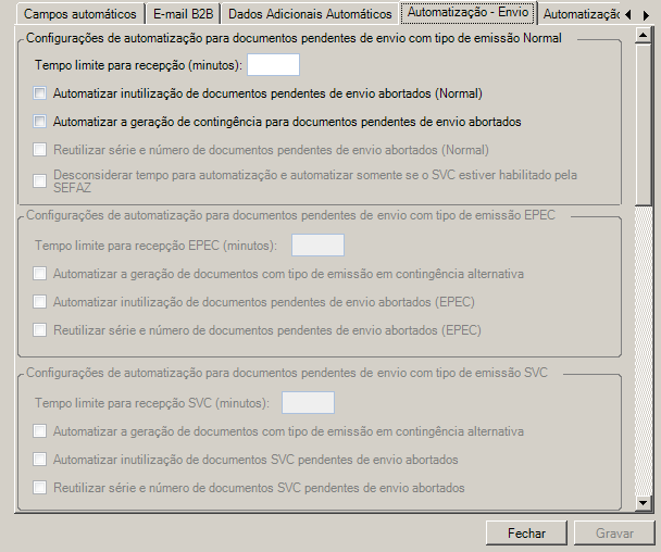 Configurações de automatização para documentos pendentes de envio com tipo de emissão SVC.