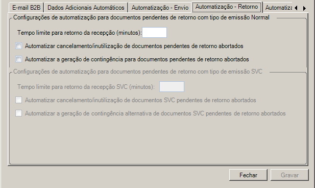Configurações de automatização para documentos pendentes de retorno com tipo de emissão SVC