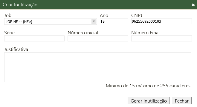 •O campo "Justificativa" virá vazio para preenchimento, sendo informada a justificativa da inutilização do documento. (Mínimo de 15 caracteres e máximo de 255);