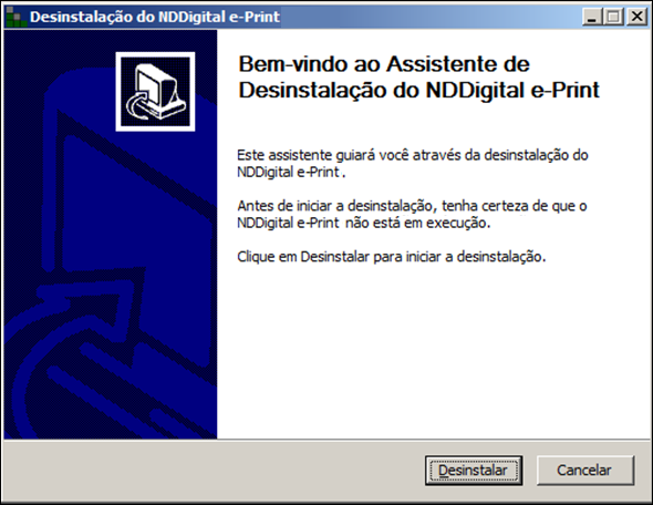 Passo 1: Tela inicial: Tela inicial da desinstalação do e-Print. Para prosseguir, clique em Desinstalar.