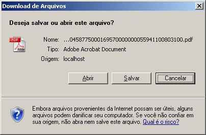 Em caso de não gerar múltiplos documentos, sendo selecionado apenas 1 documento no grid da pesquisa e apenas 1 formato for escolhido para o processo de download, não será necessário o usuário nomear a solicitação, pois o campo Identifique sua solicitação ficará desabilitado, após marcar o formato desejado e clicar em Concluir serão exibidas as opções Abrir ou Salvar o arquivo. Se a opção escolhida for Salvar, deve-se escolher um diretório para a exportação do documento.