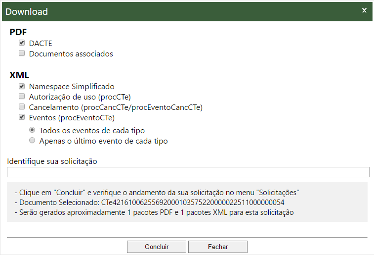 Para exportar documentos em formato PDF, é possível optar pelo download de DANFE/DACTE/DAMDFE, ou então do DANFE/DACTE + Documentos Associados ou somente Documentos Associados. Em formato XML, será enviado o arquivo XML com a Autorização de uso, o XML do Cancelamento ou XML de Eventos, que pode optar por extrair "Todos os eventos de cada tipo" que será extraído todos os eventos que tem para o(s) documento(s) e "Apenas o último evento de cada tipo" aonde será extraído o último de cada tipo de evento.