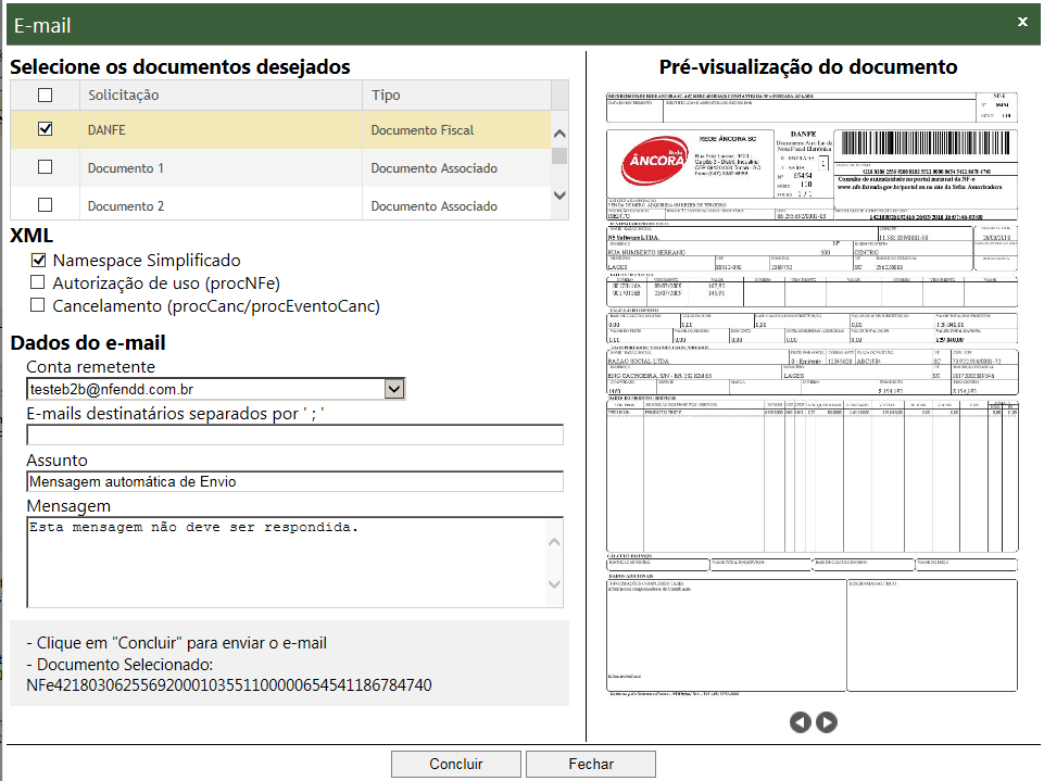 A opção de E-mail permite selecionar um documento de NF_e CT-e e MDF-e e pré-visualizar as informações antes de realizar o download.