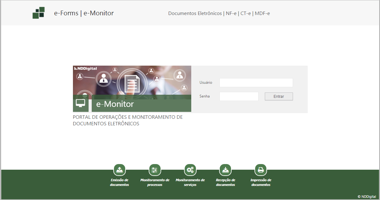 Para acessar, clique no ícone e-Monitor criado na área de trabalho, ou acesse pelo menu Iniciar> Programas> NDDigital> e-Forms> e-Connector> e-Monitor. Será exibida a tela de login. Digite o Usuário, a Senha e clique em OK.