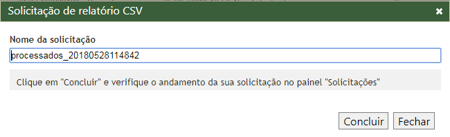 A exportação CSV esta disponível para NF-e, CT-e e MDF-e Ao realizar um download ou solicitação, no campo nome da solicitação virá uma nomenclatura padrão referenciada desta forma: processados_AAAAMMDDHHmmss - (processados_anoMesDiaHoraMinutosSegundos). Caso seja necessário salvar com nomenclatura diferente o campo vem habilitado para edição do texto. A opção Solicitação esta disponível somente para banco de dados SQL. Para outros bancos o download é feito automaticamente via browser. |