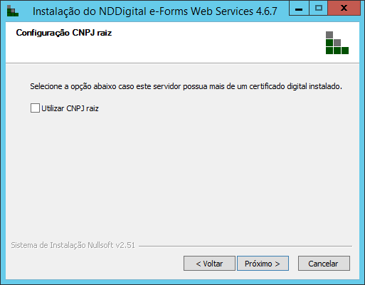 A utilização do CNPJ Raiz está atrelada a existência de vários certificados instalados no servidor. Assim, é identificado através da raiz do CNPJ, informado no XML de chamada, qual certificado deve ser utilizado para a realização da consulta. Se o ambiente onde está sendo instalada a solução possui este perfil, selecione a opção Utilizar CNPJ raiz, caso contrário, apenas confirme a instalação clicando no botão Instalar.